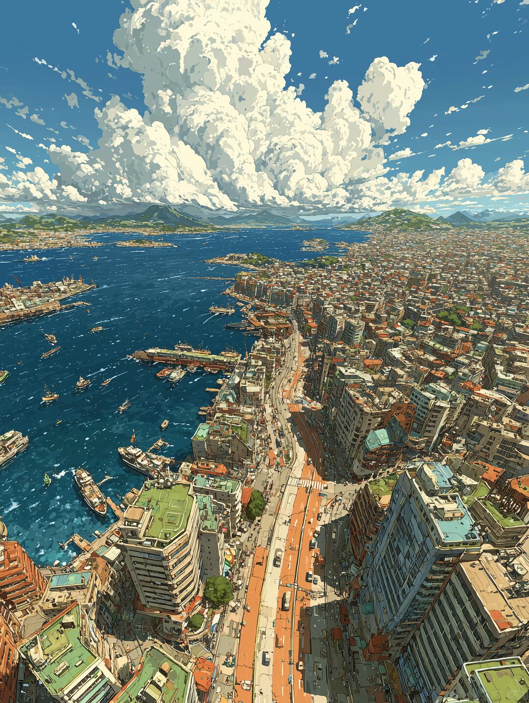 Ilustrasi kota pesisir yang padat dilihat dari sudut tinggi, menampilkan jalan utama yang sibuk dan deretan gedung tinggi dengan berbagai gaya arsitektur. Pelabuhan yang ramai dipenuhi kapal dan perahu, mengarah ke laut biru yang luas dengan pulau-pulau kecil dan perahu layar tersebar di kejauhan.